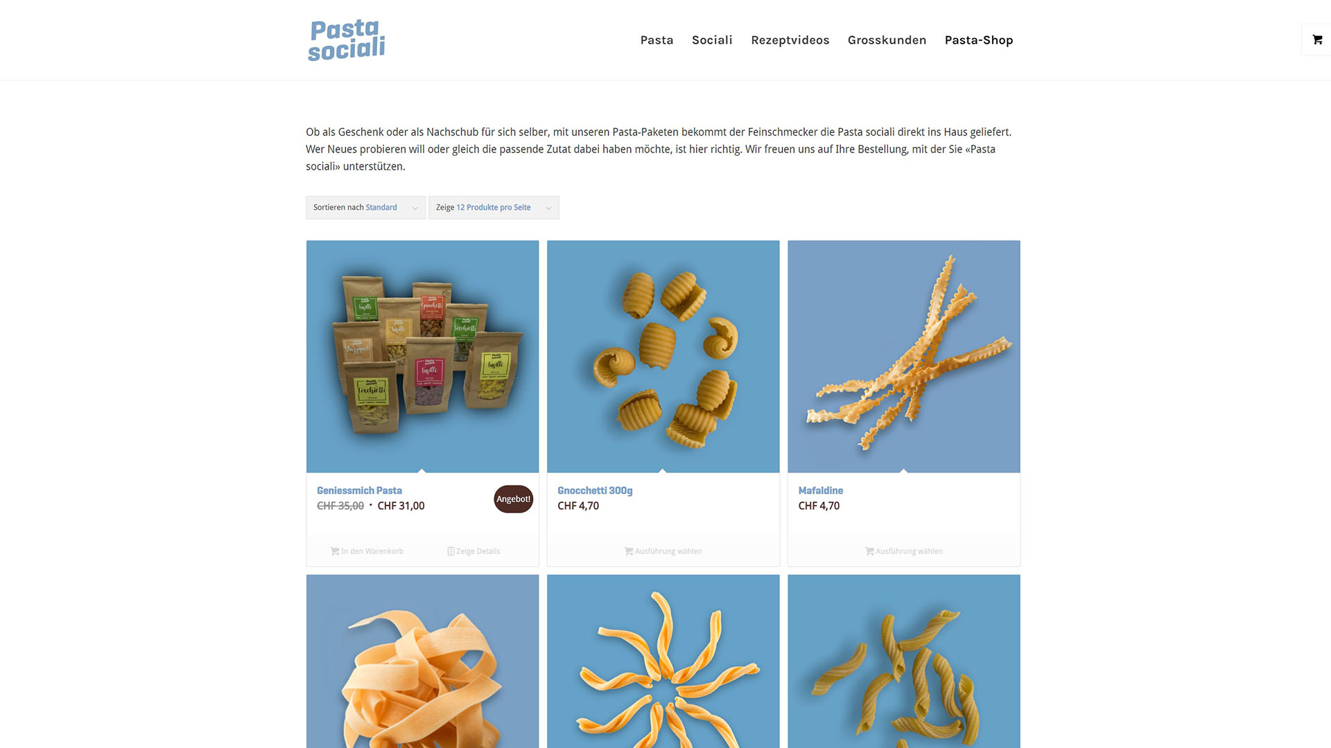 Ob als Geschenk oder als Nachschub für sich selber, mit unseren Pasta-Paketen bekommt der Feinschmecker die Pasta sociali direkt ins Haus geliefert. Wer Neues probieren will oder gleich die passende Zutat dabei haben möchte, ist hier richtig. Wir freuen uns auf Ihre Bestellung, mit der Sie «Pasta sociali» unterstützen.
